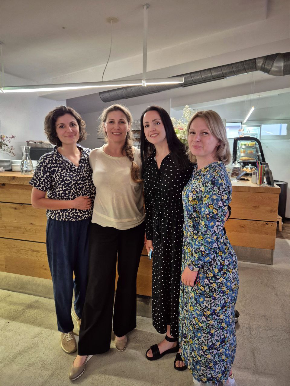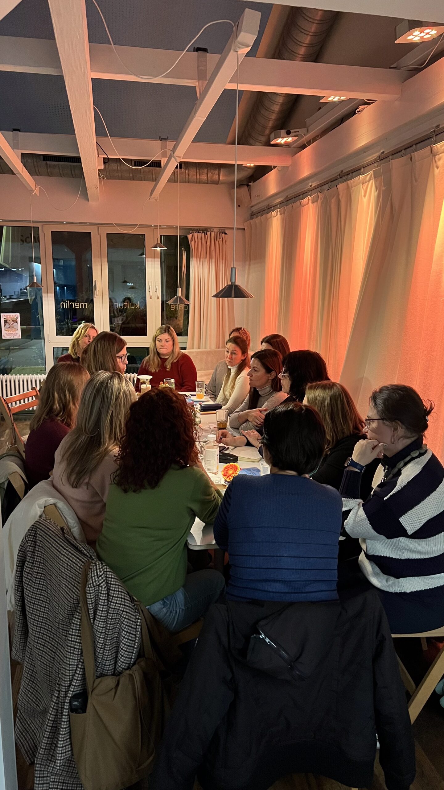 Перша офіційна зустріч відбулася в середині грудня 2023 року в кафе "Мерлін", організована Олена Бурменко (Київ) та Афіна Альбрехт (Штутгарт). Основна увага була зосереджена на обговоренні життя в Німеччині, порівнянні соціальних норм і традицій та обміні особистим досвідом. Зустріч надала можливість познайомитися один з одним, представити ідеї та проекти, а також обговорити теми, які є особливо актуальними для жінок-біженок.